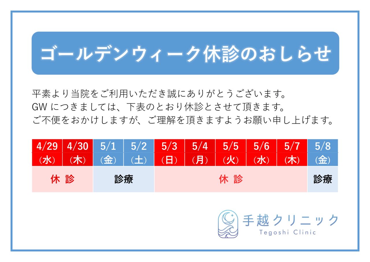 ゴールデンウィークの休診について 2026 4/20 2026-04-20 平素より当院をご利用いただき誠にありがとうございます。 GWにつきましては下表のとおり休診となりますので、予めご了承ください。 NEWS 3/15(日)休日当番医のおしらせ